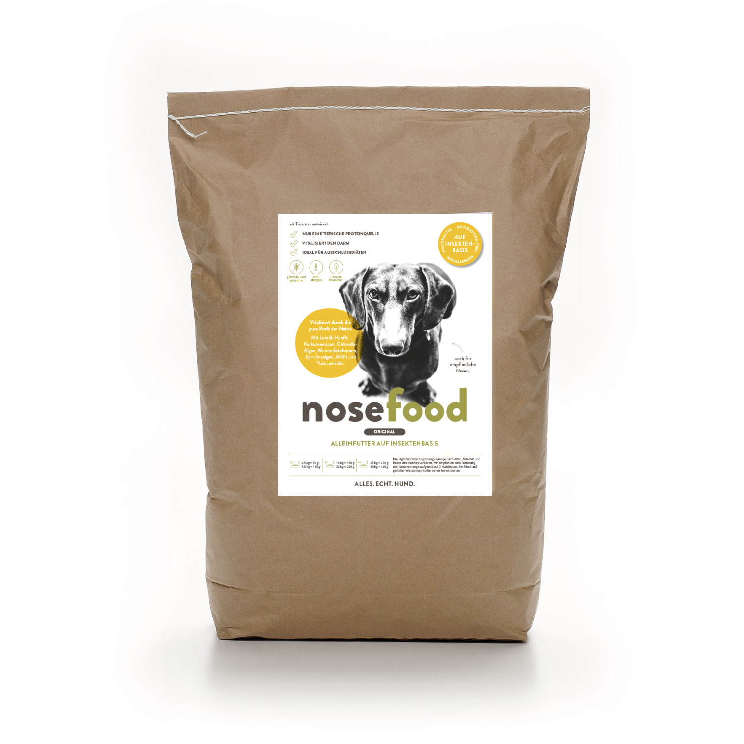 Für die Gesundheit deines Hundes deckt nosefood ORIGINAL den kompletten Bedarf an Nährstoffen, Proteinen und Fettsäuren aus ausschließlich besten und natürlichen Zutaten – frei von Getreide, Antibiotika und chemischen Zusätzen.